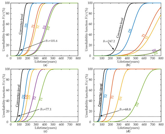 The converter-level unreliability functions of the power converters within the two considered PV-battery systems are shown in Figure 12, along with the corresponding component-level functions of their power devices. The lifetime results are in accordance with the comparison in the previous section. For the PV inverters, as shown in Figure 12a,b, the reliability of the two inverters is dominated by the reliability of the clamping diodes (e.g., D5 referring to Figure 4) and, consequently, the lifetime of the PV inverter with the DC-coupled BESS is 101.6 years, which is even higher than the twice of the lifetime of the PV inverter with the AC-coupled BESS. Notably, the results also imply that the two inverters have excessive design margins for the considered Denmark mission profile. Regarding the BESS converters, for the battery inverter, as shown in Figure 12c, instead of the clamping diodes, the outer diodes (e.g., D1 referring to Figure 7b) will have the lowest lifetime due to its bidirectional operation, and the inverter lifetime is 77.1 years. As observed in Figure 12d, the reliability of the battery converter for the DC-coupled BESS is mainly affected by the lower IGBTs (e.g., T2 referring to Figure 7a) and its lifetime is 68.8 years. Notably, both the battery inverter and the battery converter are less reliable than the corresponding PV inverters, which will seriously affect the overall reliability of the PV-battery systems.