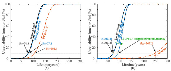 Unreliability function of the DC- and AC-coupled PV-battery system: (a) AC-coupled configuration and (b) DC-coupled configuration.