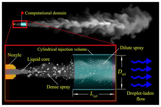 In droplet-laden (multiphase) fuel sprays, droplet atomization process plays an important role in mixing and evaporation. However, from the numerical modeling perspective, resolving near-nozzle length scales is challenging and there is insufficient experimental data available. We note that there have been some attempts to numerically resolve the primary breakup of dense sprays using e.g., the level-set method (LSM) [12] or volume of fluid (VoF) [13,14,15,16] approach, in addition to further strategies reviewed in [17]. However, in computationally expensive simulations such as reactive fuel sprays or even evaporative sprays with relatively long penetration lengths, it is a common practice to model the dispersed phase in the Lagrangian framework without resolving the liquid core and primary breakup. In these simulations, the gaseous phase is resolved in the traditional Eulerian framework. In particular for LES, a coupling between the Lagrangian particle tracking (LPT) and LES is usually utilized to model the atomized Lagrangian fuel droplets which lie in the subgrid range and to take their interactions with the surrounding carrier phase into account [18,19]. In addition, to avoid extreme computational costs, one common approach is to implicitly consider the primary breakup by introducing Lagrangian droplets with particular injection parameters and size distributions into a small cylindrical injection volume which is larger than actual fuel nozzle dimensions [20,21].
