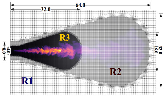 It is worth mentioning two important notes. First, the KH model constant in Table 2, which controls the stripping rate, does not hold a recommended value by default and several works have tuned this parameter according to the problem setup [89,90]. However, in diesel sprays, the value has been extensively used [34,91,92,93,94], hence the KHRT model utilizing such parameter value is herein referred to as the default KHRT model. Second, parameter values of in Table 3, which correspond to cylinder dimensions and , are selected based on the authors’ preference. However, these selected values are relevant to the a priori knowledge of the spatial information on primary breakup and droplets formation. The ratio in the table represents the number of grid cells within .