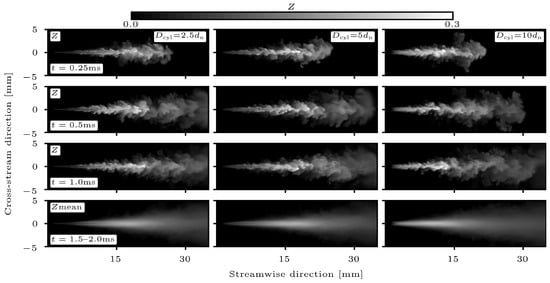 The first study investigated the effect of varying dimensions of the cylindrical injection volume, denoted by and , on the spray mixing and penetration lengths. As shown in Table 3, the first three cases A1–3 consider a constant with varying between and . Figure 3 depicts cutplanes of the mixture fraction (Z) field for each case at , , and (top to bottom) as well as the mean Z field averaged over the time interval of – (the bottom row). Two general observations can be noted: (1) the jet width downstream the nozzle became larger with larger , and (2) the jet penetration length became shorter with larger as can be seen from the first two time samples.
