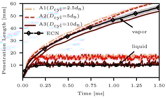 To further quantify mixing and evaporation in the mentioned sprays, liquid and vapor penetration lengths were plotted in time, and compared with the respective ECN Spray A data, as shown in Figure 4. It is observed that the introduced dimensions in cases A1 and A2 resulted in over-predicted liquid and vapor penetration lengths throughout the entire injection duration. Moreover, a slightly longer jet was noted for case A1, with the smallest , in comparison with case A2, while the liquid length was observed to be equivalent between both cases. Finally, when was enlarged to in case A3, a significant reduction in both liquid and vapor penetration lengths was observed, with a better convergence to the ECN Spray A data. Therefore, increasing was observed to reduce the jet penetration and it led to a faster liquid evaporation process.