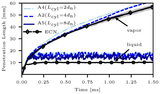 The previous discussion elaborates on the significant influence of the radial change of the injection cylinder dimensions with fixed on the liquid and jet penetration lengths. We complemented this study by further investigating the spray metrics when is axially varied. In particular, two additional test cases are herein considered, A4 and A5 from Table 3, where was varied between and while was fixed, hence was axially prolonged. Figure 6 depicts temporal evolution of liquid and vapor penetration lengths for cases A4 and A5, as compared to case A2 with the same and an intermediate value of . The figure shows a reduction in the jet length when was axially prolonged, while a mild reduction in the liquid length was attained. This observation can be referred to the droplet cloud distribution which became more relaxed with increased , hence a weaker momentum intensity since became distributed over a larger volume. According to the presented discussion, it is concluded that a radial change of had a stronger influence on both liquid and vapor penetration lengths when compared to the axial variation of . This behavior corresponded to the direction of change being aligned with the direction of the largest gradients in the cross stream direction, hence enhancing the mixing process, while smaller changes in scalar gradients were noted in the axial direction. Overall, varying with a fixed impacted the axial magnitude of , which played a significant role on the spray metrics.