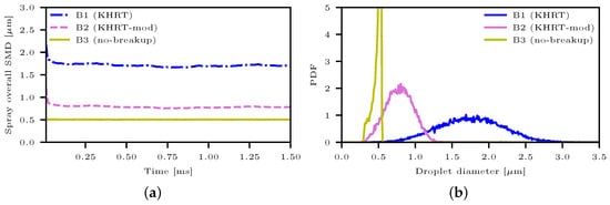 Before progressing with analyses, a comparison of liquid droplet size distributions in the considered cases was depicted through the global SMD temporal evolution within the injection duration, Figure 7a, in addition to the probability density function (PDF) of droplets diameters at time after the start of injection (SOI), Figure 7b. First, the non-fluctuating nature of the temporal droplet size profile suggested that the corresponding PDFs did not alter their mean distributions during the entire injection duration. Second, it is observed that the average droplet sizes doubled between the three cases, particularly when moving from a complete atomization assumption in case B3 ( with constant droplet size) to the droplets breakup with a faster stripping rate assumption in case B2 (smaller value in Equation (10)) until the slower stripping rates in case B1. In addition, from the reported experimental [87,100] and numerical [101] works, the measured SMD ( sufficiently far from the nozzle) was found to be in close agreement with cases B2 and B3, compared with case B1.