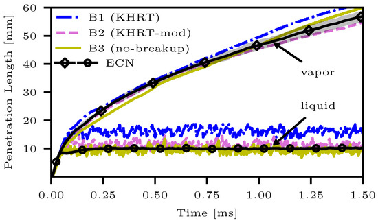 As a first analysis of the breakup model—or rather the droplet size—comparison, Figure 8 depicted liquid and vapor penetrations considering the respective three test cases B1, B2 and B3 in Table 3. The over-predicted spray penetration lengths could be adjusted by controlling the KHRT breakup time. In particular, a faster stripping rate implied a lower droplet and faster evaporation, with a better convergence to the ECN Spray A experimental data. More importantly, when the no-breakup model was used in case B3, the liquid penetration was observed to be similar to the modified KHRT model (case B2) and both cases presented a very good agreement with the experimental data.