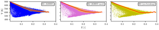 After discussing the breakup model effects on spray penetrations and on radial distributions of Z, a further analysis is performed with relevance to the droplet heating and vaporization. As depicted in Figure 10, scattered data points of the temperature field are plotted in Z space for the spray region (conditioned by ) at time after SOI, and overlayed with conditional means (red curves) and standard deviations (filled regions). Two main observations can be herein noted. The first observation is the occurence of low temperature data points in case B1 within lean regions of the spray. This can be explained by the large droplet sizes, c.f. Figure 7, for case B1 with relatively long liquid lengths which implies stronger cooling effects away from the nozzle. Accordingly, having smaller droplet sizes in cases B2 and B3 would enhance mixing with the hot ambient and thereby the tendency of those lean regions to rapidly heat up, i.e., low temperature data points disappear, and approach the ambient temperature value. Interestingly, this breakup model-induced cooling effects could play an important role in reacting simulations, when most reactive zones and subsequently high temperature ignition kernels are realized within the spray periphery to identify the ignition delay. Following previous notes, the second observation is the larger Z magnitude in the case B3 with no-breakup model (smallest droplet sizes) which implies richer mixtures due to fast evaporation, hence the tendency to have a narrower Z distribution with larger droplet sizes, as noted in the case B1. It is important to mention that these observations were consistently noted afterwards throughout the injection duration, and only the data at after SOI is herein presented for brevity.
