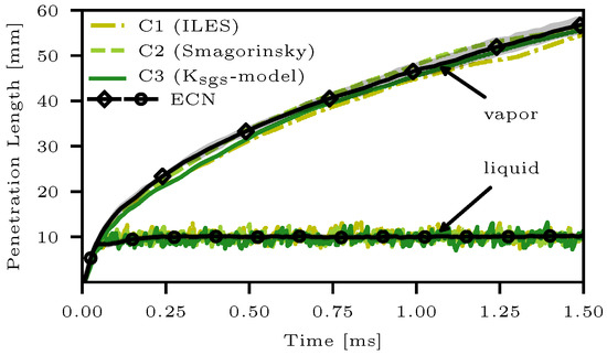 The third study investigates the spray characteristics when the SGS model is varied between ILES, Smagorinsky, and K-model, while utilizing the no-breakup model and a constant . Figure 11 depicts spray liquid and vapor penetrations for cases C1, C2 and C3 in Table 3. Overall, it is shown that all the mentioned cases with different SGS models perform equally well on predicting the liquid length, while a slight discrepancy is observed for the jet length, in comparison with the experimental data. We note that the similarity of results with different SGS approaches is related to the considered grid resolution of with which most of the important length scales are already resolved.
