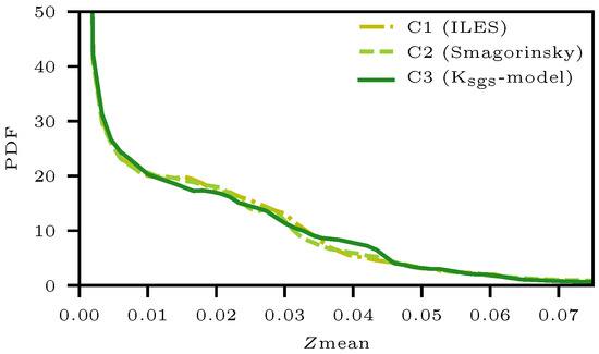In order to assess the spray mixing characteristics in the mentioned cases, first, the PDF of the mean mixture fraction was plotted in Figure 12. The sampled data considered only the spray region, which was identified by grid cell centers of value , and the PDF bins were weighted by normalized cell volumes. Here, the PDF analysis shows that the considered test cases with varied SGS models demonstrated equivalent distribution of the mean Z. This observation suggests that SGS effects were insignificant on the spray mixture characteristics since the measured quantity essentially depended on the resolved scales, and it was a function of the scalar mass transfer corresponding to droplet evaporation.