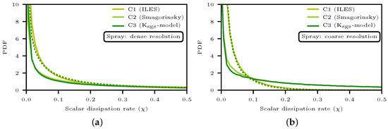 In the dense mesh region of the spray, the corresponding PDF resulted in Figure 13a show that, first, without SGS contribution (), all the cases exhibit equivalent distribution of . In particular, since D held a similar value in the three cases and by considering the same mixture composition and thermal properties, the resulting PDFs demonstratde statistics of the magnitude of the resolved scalar gradients, , which were observed to be insensitive between the cases. Second, when accounting for SGS contributions (), it is observed that there was not a large difference between ILES and explicit models in most of the larger values, whereas notable variations were observed within a small range of low dissipation rates. Except for this narrow window of small values, this plot indicated that SGS effects on the prediction of were rather small in this dense resolution.