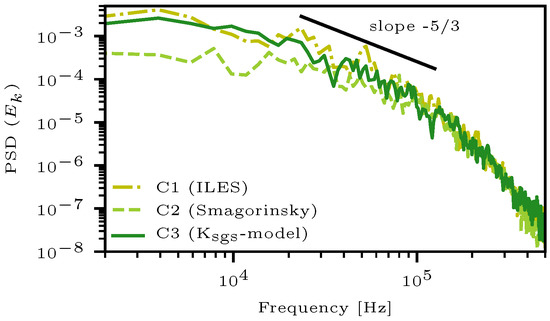 After demonstrating SGS effects on molecular mixing and scalar dissipation rates, their effect on the dissipation of kinetic energy () is another criteria to be explored in assessing the LES overall quality. Here, spectra are demonstrated through a power spectral density (PSD) plot, depicted in Figure 14. The velocity signal, recorded for 2 simulation time with the sampling frequency , was probed at a location () away from the nozzle and 1 () off the spray centerline. The PSD was computed based on the Welch estimate [105] with modified Bartlett–Hann window [106] along multiple overlapping segments of the signal.