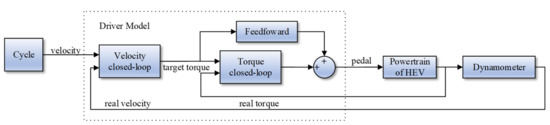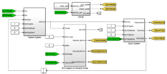 The basic principle of RLS based on the forward model is to use the torque generated by the powertrain of HEV to drive the vehicle model to get the target rotation speed and control the dynamometer to track that speed to simulate the real road resistance [14,15]. The RLS based on the forward model is more stable, because it avoids differential calculations. The process is shown in Figure 3.