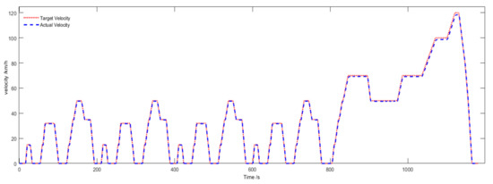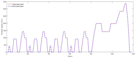 According to Figure 9, the maximum difference between the cycle velocity and actual velocity does not exceed , which illustrates that the powertrain and parameters of the vehicle are matched, and the driver model can accurately track the target velocity by adjusting the accelerator pedal and brake pedal. Figure 10 shows the difference between the target rotation speed and the actual rotation speed of the dynamometer does not excel 4 r/min, which illustrates that the theoretical analysis and simulation results are consistent.