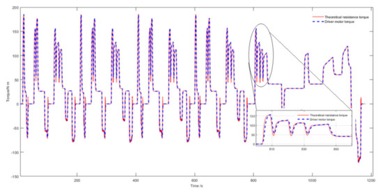 Figure 11 presents the theoretical resistance torque and the torque of the drive motor which is the only power resource of the vehicle. The theoretical resistance torque is the product of the target rotation speed and the vehicle inverse model , and the expression in the time domain is shown as Equation (14). It is known that the transfer function between the theoretical resistance torque and the dynamometer torque is the first order inertia link with a time constant without considering the interference of The difference between the two does not exceed which verifies the theoretical analysis and simulation results are in agreement.