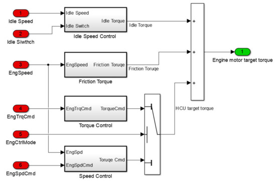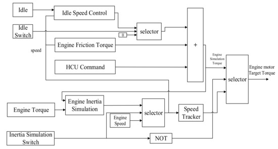 The engine motor needs to emulate the operation process of the engine including start, stop, idle, speed control, torque control, speed control, and engine friction losses such as pumping losses, and accessory loss. Engine motor torque consists of three parts, idle speed control torque, friction torque, and the torque command of HCU. HCU outputs many signals to the engine simulation model, including idle speed, idle switch, engine control mode, engine target torque, engine target speed, etc. The engine simulation model outputs target torque to the engine motor to emulate the performance of the engine. The algorithm of engine simulation is shown in Figure 14 and Figure 15.