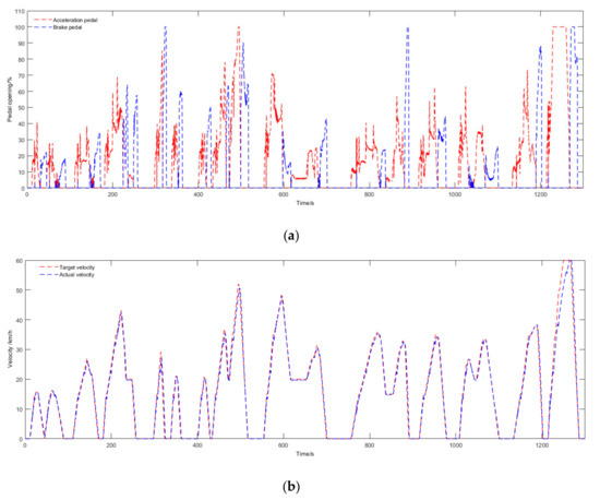 Figure 17a,b shows the velocity tracking curves, the accelerator pedal signal, and the brake pedal opening. According to the figure, the difference between the target velocity and the actual velocity in the range of is no more than , but that in the last part of the cycle is quite different. It is known that the accelerator pedal is at this time, and the powertrain is working at full load. It can be inferred that the powertrain output torque is insufficient at this time, so the actual vehicle speed cannot track the target vehicle speed.