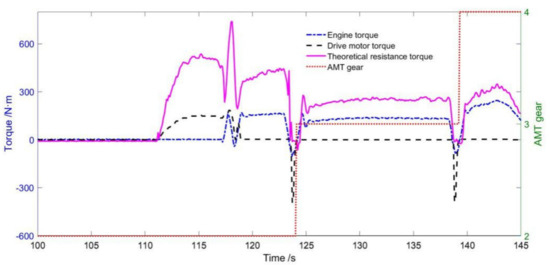 Figure 18 displays the torque curve of each component during the test, and data was selected for analysis. When the vehicle starts, the motor is driving separately; the engine does not output torque; when the engine starts, the motor output torque is , the engine works alone. When the driver brakes, the motor outputs negative torque for braking energy recovery. The vehicle starts at 2nd gear and shifts according to the vehicle speed and the accelerator pedal opening. Since the load system is connected to the output shaft of the transmission, the torque of the load system is approximately equal to the torque produced by the engine and the motor.