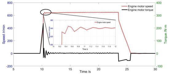 During the time of , the engine motor maintains idle state. The test-bed controller controls the engine motor speed to stabilize at , and the upper and lower fluctuations are . As the engine motor’s rotational resistance torque is small, the engine motor’s output torque is also small. At , the controller receives the stop command from the HCU. The engine motor simulates the engine resistance. The engine motor rapidly decreases to under the action of the engine resistance. The stop command is completed, and the shutdown process takes about .