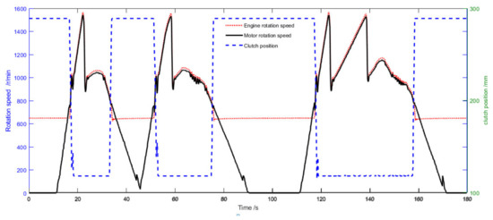 Figure 21 shows the engine motor as the engine participation in the drive process. At the start, the transmission shaft speed is lower than the engine idle speed, the clutch is disengaged, the engine maintains idle speed, and the motor drives the vehicle to accelerate separately. When the transmission shaft speed is higher than the engine idle speed, the clutch is engaged When the clutch is engaged, the speed of engine is equal to the speed of motor. Due to the shift mode without the clutch, the clutch does not need to be separated during the shifting process. When the vehicle is stopped, the velocity of the vehicle is reducing. When the transmission input shaft speed is lower than the engine idle speed, the clutch is separated, and the engine maintains idle speed state and waits for the next clutch engagement.