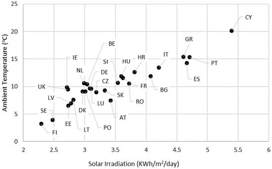 As expected, the left low area of the points refers to North European countries, with Finland and Sweden having the lowest values of ambient temperature and solar irradiation at about 3.5 °C and 2.4 kWh/m2/day, respectively. On the other hand, the climatic conditions in South Europe are significantly hotter, which led to higher values of their relative meteorological characteristics; Cyprus is the warmest region in Europe by far, with a mean ambient temperature of 20 °C and solar irradiation of 5.4 kWh/m2/day.