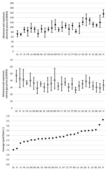 Average, minimum, and maximum energy prices and spark ratios of European countries (values for the 2008–2018 time period).