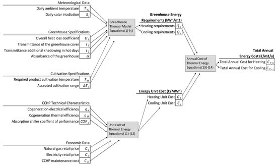 An information flow diagram of the proposed mathematical model is presented in Figure 3, which considers the cultivation of products with similar cultivation specifications. The greenhouse thermal model estimates the annual heating and cooling requirements (,) of the facility per unit area (kWh/m2) based on the meteorological data of each country (ambient temperature, solar irradiation), the greenhouse heat transfer characteristics, and the product cultivation requirements. The unit cost of thermal energy (,) is estimated given the CCHP technical efficiencies and energy prices of each country. Finally, the total annual cost of energy per unit area (,) with the use of cogeneration (€/m2/y) is determined from the energy requirements (,) and energy unit cost (,).