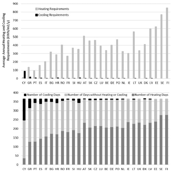 Summarized results of all EU countries. Annual heating and cooling requirements and number of days with heating, cooling, and no energy requirements. Average values for the 2008–2018 period.