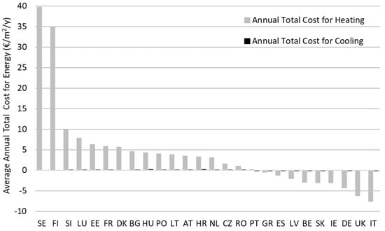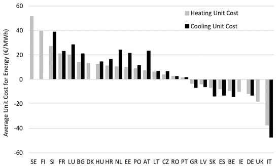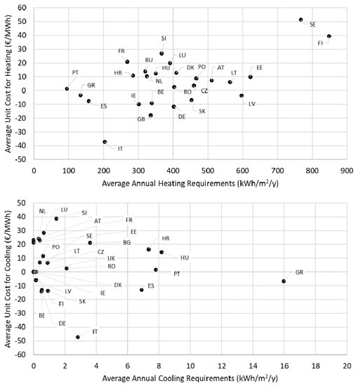 Two different costs for the greenhouses were calculated: (a) the unit cost of energy (heating and cooling) produced by the CCHP system (€/MWh) (Equations (11) and (12)); and (b) the annual total cost for heating and cooling per greenhouse unit area (€/m2/y) (Equations (13) and (14)). The former depended only on the technical efficiencies of the technology and the energy prices of each country (Figure 5), while the latter depended on the former, as well as on the annual heating and cooling requirements of each facility (Figure 6), which were directly related to the climatic conditions. In Figure 6, the heating cost is depicted using grey bars, while the cooling cost is represented using black bars. As can be seen, cooling cost is always a bit higher than heating in relative values, due to the relatively low coefficient of performance of the heat-driven absorption chiller. In countries where no cooling costs are depicted, no needs for cooling were found during the examined time period (2008–2018). Cooling needs in absolute terms were disproportionally lower than heating, which dominated the total energy costs. Figure 7 maps this parameter space in two dimensions: countries with low energy requirements and energy costs (bottom left corner) had favorable conditions for cultivation, while countries in the top right corner had high costs associated with cultivation as a result of market and weather conditions.
