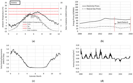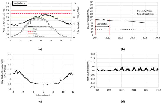 The Netherlands had an average ambient temperature and solar irradiation of 10.6 °C and 3 kWh/m2/day, respectively, during the decade 2008–2018 (Figure 9a). The annual heating requirements were on average 325 kWh/m2, while in the summer months the greenhouse could maintain the proper cultivation conditions without any additional energy input (Figure 9c). The electricity prices had a downward trend, with an average value at 93.6 €/MWh. On the other hand, natural gas prices did not fluctuate much. In fact, the maximum price was obtained in 2013 at 38.2 €/MWh, while the minimum was 31.7 €/MWh in 2017 (Figure 9b). The combined behavior of energy prices after 2010 led to a decrease in the spark ratio, which fell below the threshold of 3, and since then heating cost with cogeneration has increased significantly (Figure 9d). However, this was proven to be lower than in Estonia.