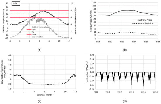 Evolution of seasonal greenhouse energy cost in Italy during the 2008–2018 period. Summarized results of (a) climatic conditions, (b) evolution of energy prices, (c) energy requirements, and (d) evolution of energy cost.