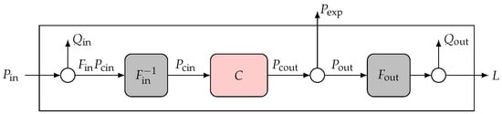 The operational optimization is based on a model of energy transmission and transformation called the Energy Hub, conceptualized in [56] and instantiated as a sequential structure presented in Figure 2. This model is used to simplify the grid of the island as follows: The Hub is supplied with input energy which, as other variables in the model, represents a vector of instantaneous values of a certain physical quantity, in this case power coming either from the submarine cable or local generation. In this model, each type of carrier can be limited in a different way. For example, the import from a cable connection can be considered to be a variable that has a value between zero and the maximum power transmission capacity of the cable. On the other hand, all energy produced by the renewable sources has to be imported and either stored in the input stage storage () or the output stage () for later use, exported as or used to fulfill the load . In the path from the import stage to the load, the energy passes through several stages: input transformation (defined by the block), conversion (defined by the C block) and output transformation (defined by the block). This allows for the modelling of ways in which different energy carriers can be mixed together or depiction of losses associated with necessary transformations in this process.