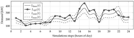 In this methodology, the load in the Hub is considered as a variable that can be optimized between a lower and an upper limit, constructed around some baseline load value . Different levels of user willingness to adjust their loads are expressed by varying the width of the band between and . If is assumed to be the flexibility of the demand, the aforementioned limits can be constructed as