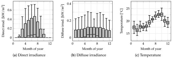 Due to mentioned regulatory limitations and the illustrated potentials, this paper will focus on a theoretical photovoltaic generation deployment scenario in the capital of La Graciosa, Caleta de Sebo (at the specific location of and ). In order to illustrate the potential of solar energy for this site, interfaces for an international official database [71] were used and hourly meteorological data depicting irradiance components and temperature was obtained. A summary of the data is illustrated in Figure 4. As can be observed, the direct irradiance has a noticeable seasonality, peaking during the summertime while, on the other hand, diffuse irradiance is relatively constant. The temperature on the island appears to be moderate with monthly mean values between and which can be beneficial as the photovoltaic production is sensitive to overheating issues.