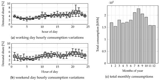 Monthly seasonal variations in hourly electric energy consumption share for working days (a), weekend days (b) and total monthly electric energy consumptions (c) based on data provided by Fenie Energia.