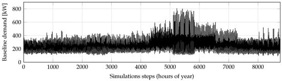However, since total monthly consumption data is available, and is depicted in Figure 5 also, the hourly data can be scaled up with the appropriate monthly consumption divided by the total number of days in each month so that an estimated consumption curve can be obtained. In order to make this process more realistic, random unit white noise samples (, ) are scaled into the range to model hourly noise and into to model monthly noise and are superimposed to the 100% of the demand that would have been calculated without the given noise levels. The resulting demand profile is illustrated in Figure 6 and this profile is used as the baseline load , mentioned previously, around which a flexibility band will be formed.