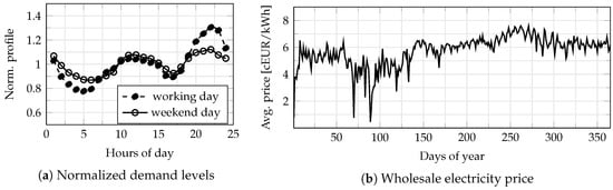 Survey data [60] indicates that 558 out of 613 (approximately 91%) grid-connected users in La Graciosa are contracted to a single rate tariff (with maximum power draw of ) with a fixed price of , so this value is assumed as the cost at which power can be imported from the submarine cable. In a scenario where renewable generation would be community owned, besides the cost of acquiring the system and its maintenance, the energy it generates comes without direct costs, and the excess energy can be sold on the wholesale market. Using the interfaces provided by OMIE [73] (Due to the crises related to COVID-19 ongoing at the time of writing this paper and the changes in the API provided by OMIE which now only provides the last year of hourly wholesale prices, historical (previously acquired) data was used for 2018 in order for the price profile not to include the months of February, March and April of 2020 which saw significant price fluctuations attributed to the effects of the pandemic that do not depict general trends), the hourly price profile for the year 2018 can be constructed. Namely, for each month and each first working and weekend day of that month, hourly prices have been obtained. These values are then normalized for each month into hourly profiles for a typical working and weekend day so that the average of both profiles equals one and are illustrated in the left side of Figure 7. Then, for each day of the year, the average wholesale price was obtained and is depicted in the right side of Figure 7. Afterwards, day by day, these daily values are used as a scale factors that are applied to the corresponding working or weekend day price profile. By concatenating these profiles together, the estimated hourly wholesale price profile is derived which is assumed to be the export price of electric energy.
