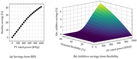 The first evaluated effect relates only to the potential savings that can be achieved from the implementation of renewable generation (i.e., without any demand flexibility). In order to derive this, only scenarios with zero flexibility are extracted and their operational costs are compared to the baseline scenario with no renewable generation. The resulting savings are shown on the left side of Figure 8.