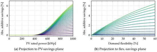 By analyzing all three graphs, it can be clearly deduced that there is a notable increase in the performance that can be achieved by utilizing demand flexibility when there is ample renewable generation as the load can be more drastically shifted and aligned with renewable generation. An interesting point to note is that the impact from the demand flexibility only becomes apparent when the rated power capacity of RES becomes large enough (compared to the baseline demand levels) which, according to the results of the conducted simulations, is between and , at the point where the lines from the projections in the left of Figure 9 begin to diverge. Having in mind the fact that the efficiency of PV generation is calculated very conservatively with noticeable losses, it should be mentioned that this point of divergence may occur with less renewable generation if a more efficient system were to be considered. Also, the second projection graph from Figure 9 shows that for each renewable generation capacity, the returns tend to level off after a certain amount of flexibility with the value of that point increasing as the capacity of the generation increases.