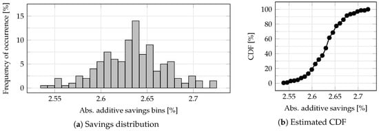 Histogram illustrating the distribution of the absolute additive savings in 25 bins for the considered realistic use case (a) and the corresponding estimate of the cumulative distribution function (b).