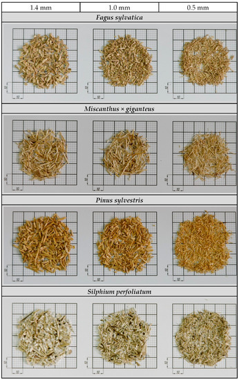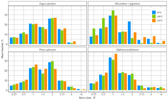 The samples’ particle size distribution (PSD) varied significantly (Figure 1). This is mainly due to the different shapes of the ground fragments of steams (Miscanthus and Silphium) and chips (woody biomass). Before the main grinding stage, the PSD of all samples was standardized. This allowed us to avoid the influence of different input PSD on the output PSD.