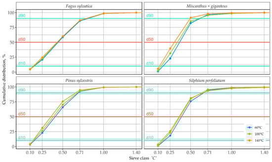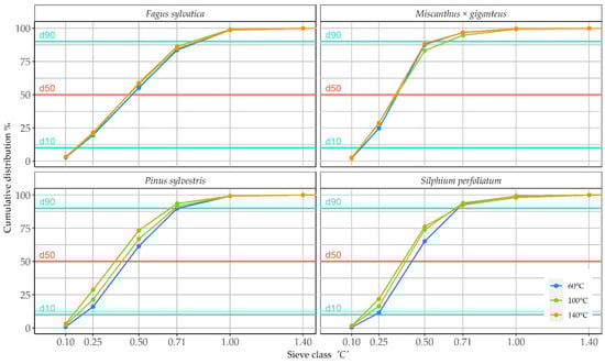 In the case of the hammer system, for most materials, a slightly different course of changes was observed (Figure 4). Accumulated curves of Pinus and Silphium showed minor changes compared to those milled with the knife system. Fagus, as for the knife system, did not show grindability dependence on drying temperature. The most significant changes for all d were observed for Miscanthus. Observed changes in cPSD indicate that an increase in drying temperature affects noticeable grindability. This is in line with the common trend observed for biomass [87,89,91]. This is probably because a drying temperature above 100 °C causes structural changes of biomass, which makes it more fragile.