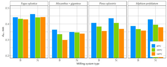 Figure 5 presents a comparison of the d50 analysis of all samples. In general, the lowest values of this parameter were for Miscanthus. This indicates that this material, during milling, produces the majority of fine particles (mean value of d50 of all samples is 0.34 mm). Slightly coarser particles would be obtained for Pinus and Silphium (d50—0.39 mm) and for Fagus (d50—0.44 mm). Comparing the milling systems in most cases, the sample ground on the hammer system had a lower d50 compared to that milled on the knife system. The only exception was Miscanthus dried at 60 °C, where the trend was reversed. A similar trend was observed by Kirsten et al. by studying grass (hay) grindability [72]. The greatest differences in d50 values caused by the milling system type were observed for biomass dried at 60 °C. The increase in drying temperature resulted in a decrease between d50 values. The exception was once again Miscanthus, this time dried at 140 °C. The influence of drying temperature on grindability is clear for Pinus, Silphium (independently of milling systems), and Miscanthus milled with a hammer system. Grindability increases (d50 value decrease) as the drying temperature increases. In other cases, the changes were less intense. Among the tested samples, the best grindability was recorded for Miscanthus dried at 140 °C and milled on the hammer system (value d50 of 0.3 mm). The worst was acquired for Fagus at 60 °C with the knife system (d50 of 0.46 mm). This can be explained by the origin of the biomass. Fagus is a hard wood material with high solid density (0.66 g/cm3) and Miscanthus grass has a value of 0.37 g/cm3. Pinus as a soft wood material has a grindability between Fagus and Miscanthus (DE = 0.51 g/cm3). For these materials, the assumption that higher DE values causes a decrease in grindability is valid. In the case of Silphium, the grindability was at the Pinus level even though the DE was only 0.22 g/cm3. Solid density of Sylphium was lower than the value for Miscanthus, which is why the grindability of these materials is not comparable. This is probably due to the structure of Sylphium, which has a light, spongy core inside that is not very susceptible to grinding. In the cases studied, the appropriate fineness was obtained, defined by the value of d50, which is required for pellet production. It is recommended that it is 0.6–0.8 mm [84], 0.5–0.7 mm [85], or even 0.2–0.4 mm [77].