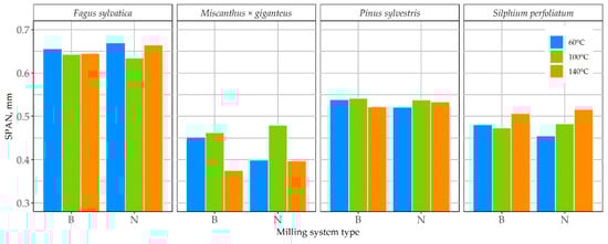 SPAN (Figure 6) is a very useful quantity when we want to take into account the changes in values of d10 and d90. The values obtained inform us on how broad the difference is in the dimensions of 80% of particles in the sample. A smaller value means a greater dimensional uniformity of the material. The Fagus is characterized by the highest SPAN values (average 0.65 mm). Pinus and Silphium had values of 0.53 mm and 0.48 mm, respectively, while Miscanthus had a value of 0.43 mm. In our case, the woody biomass did not show dependence on the milling system as well as on temperature, with an exception for Fagus dried at 100 °C and milled on a knife system. In the case of Silphium, especially in the knife system, SPAN value increased with the drying temperature, which means that the uniformity of particle size decreases. The greatest variation was found in Miscanthus samples. The material dried at 100 °C, the knife and hammer system, and the 60 °C hammer system achieved a SPAN value of about 0.46 mm, while the other variants achieved an average of 0.38 mm. This information is important from the point of view of further use of the ground material. If the material is to be used for combustion or fertilizer purposes, its dimensional uniformity is important, so a minimum SPAN value [42,87]. In the case of the pressure compaction of biomass, dimensional homogeneity is not always recommended, and it is often stressed that in a decaying material there should be particles with a wide dimensional range so that large particles would form a skeleton of the agglomerate and its fine filling [75,104,105]. Therefore, it would be necessary to determine what SPAN value is optimal for biomass compaction processes and assess the ground material from this angle.