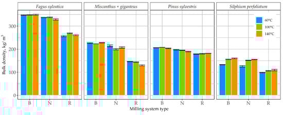 The changes in the bulk density (BD) is the second method used in the assessment of grindability. Figure 9 shows both BD of the material before and after grinding. It is noteworthy that although the PSD of a raw material is standardized, its BD changes, depending on the type of material and the drying temperature. Differences in BD values between materials were due to the difference in their specific densities. Comparing the changes within a given biomass type, it should be stated that in relation to the input material, the BD of the material after grinding always increased. This relation confirms that in the literature [80,106]. The highest increase was observed for Miscanthus, Fagus, and Silphium, and in the case of Pinus, the changes were insignificant. Only the Silphium biomass showed a clear dependency of BD to temperature. The increase in drying temperature caused an increase in BD. A comparison of the milling systems showed that the hammer system gives a material with slightly higher BD values compared to the knife system. The exception was for Silphium, where this dependence did not occur.