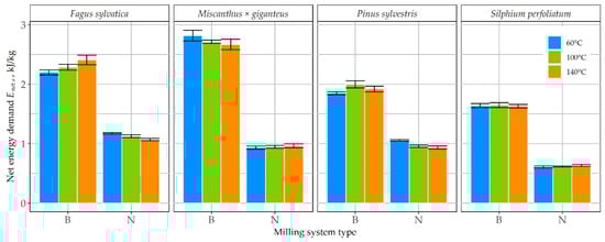 The estimation of energy expenditure is important in assessing the profitability of technology. One of the key indicators is the net energy demand, which is the energy consumption of the process. Very often, the energy consumption is related to a unit of mass or volume. Analysis of the Enet.s (Figure 12) indicates that the hammer system is more energy consuming. In any case, the increase in energy consumption compared to a knife system is at least twofold. The highest values were achieved for Miscanthus and Fagus. It is hard to determine any clear correlation of Enet.s and drying temperature. In the case of the hammer system, we observed an upward trend for Fagus and a downward trend for Miscanthus. In other cases, the differences were not significant. In general, the lowest net energy demands were obtained for Silphium. For this type of biomass, Enet.s was on a similar level within the milling system. At this stage, it is not possible to state the reason for these differences.
