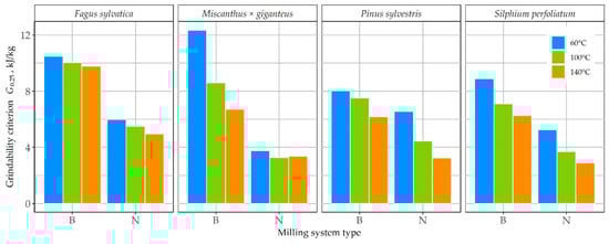 The grindability criterion is more precise in energy demands analysis. It gives information on which part of energy was used to produce the finest particles. In general, this can be treated as milling efficiency. Figure 13 presents the G0.25 in relation to the temperature and grinding system. As in the Enet.s case, better results were obtained for the knife system. There were more visible relations with temperature. In all cases, an increase in drying temperature provided positive feedback to the G0.25 factor. This shows that materials dried in high temperature are vulnerable to producing finer particles at output during milling. Furthermore, for Silphium, there was a very noticeable relation.