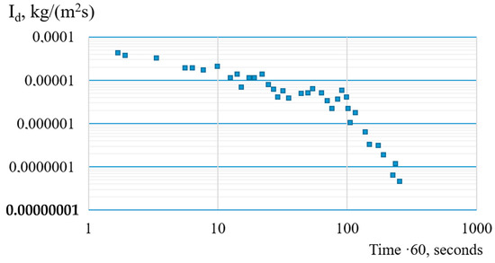 For each experiment, the pressure and temperature were set and maintained at a constant using a thermostat and gas pressure regulator 4. In the experiment, the values of thermodynamic parameters corresponded to the hydrate formation area of studied gases at temperatures close to zero. Figure 2 shows the experimental values of the intensity of propane hydrate synthesis. The plant ensured stable gas temperature at a specified level by means of the external refrigerator. When undertaking the experiment, the reactor was first filled with the gas mixture at the temperature of 10 ÷ 15 °C. After temperature regulation, the initial pressure was measured. The temperature in the reactor was then reduced to the hydrate formation temperature and maintained for a specified time interval, and then time and gas pressure were monitored. The hydrate formation process occurs at the stationary phase interface. The experiment ended with an increase in the reactor temperature, hydrate dissociation, and gas volume measurement. Figure 2 shows the dependence for propane as an example. Here, if we divide Id value by the specific (initial) mass diffusion rate, we obtain a similar dependence of the synthesis rate change, which is characteristic of all the studied gases. The change in thermodynamic parameters does not affect the type of this dependence. However, the increase in supercooling of the liquid accelerates the synthesis process. The obtained results show that after reaching the temperature of hypothermia at 2.5 °C, the active hydrate formation of propane occurs, and the intense slowdown of mass transfer continues, despite the fact that there is hypothermia and sufficient excess pressure. Obviously, the crust of the formed hydrate dramatically slows down the process of subsequent hydrate formation.