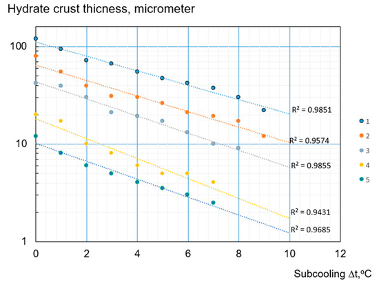 By using surfactants of various kinds, it is possible to significantly change the strength of the surface tension on the gas–water phase interface surface. Experimental studies show that the reduction of surface tension forces significantly affects the speed of gas hydrate formation and increases its gas capacity [12,41].