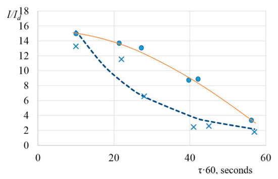 Increases in the intensity of mass transfer between propane and water when a high-speed mixer is used, compared to free diffusion mode: ×-fixed interphase surface; - mixer rotation speed is 92 rpm.