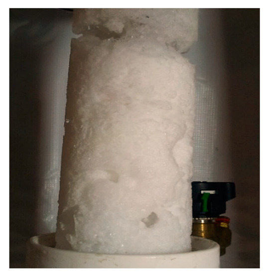 The proposed mathematical model makes it possible to establish an effective pressure–temperature ratio for the hydrate formation process. With such thermodynamic parameters, the amplitude and frequency of bubble size change and thermodynamic parameters inside the gas bubble can be achieved; the hydrate film will be deconstructed to ensure a stable hydrate synthesis rate over time. The hydrate samples shown in the photos were obtained as follows (Figure 6). They can remain stable for a long time and allow an investigation of the conditions of the storage or transportation of gas hydrates over certain distances. The results of such studies will be presented in follow-up articles.