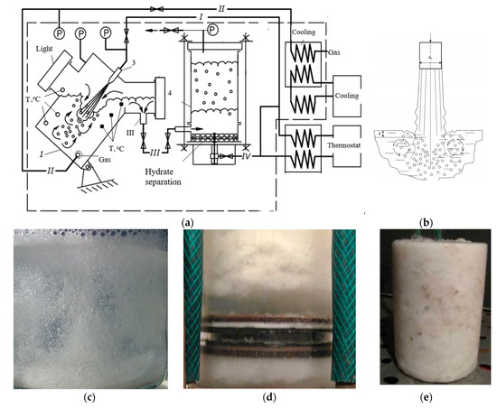Since the hydrate crust is formed on gas bubble surfaces and can be easily deconstructed under certain thermodynamic conditions in the reactor and through the implementation of hydrodynamic dispersion of phases with the fastest possible renewal of the contact surface, jet apparatus 3 was used in the facility, shown in Figure 6. In reactor 1, gas bubbles are formed (Figure 6b) and are subjected to variable deformation. As a result, the hydrate crust formed on their surface is destroyed. Hydrodynamic and thermodynamic parameters in this work were determined experimentally and modelled using the mathematical equations shown in Section 4.